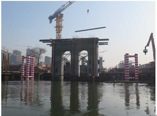 沙潁河QL-03標(biāo)主橋主墩墩柱共6根,位于沙潁河河道兩側(cè),高22.5m,其中水下部分10.0m,中墩為3.0×3.0m方形柱,邊墩為半圓形墩柱,尺寸為R180cm×3m×3m。自5月份開始鋼平臺(tái)施工以來,在公司的指導(dǎo)和幫助下,項(xiàng)目部全體職工齊心協(xié)力,先后克服了24m鋼板樁插打困難、圍堰內(nèi)基坑開挖深度大(開挖達(dá)12m)、下部結(jié)構(gòu)受鋼板樁圍堰內(nèi)圍