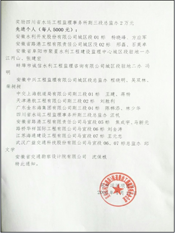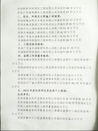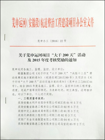 蕪申運(yùn)河城區(qū)段02標(biāo)2015年在工程質(zhì)量、工程進(jìn)度、完成產(chǎn)值都圓滿完成業(yè)主計(jì)劃進(jìn)度目標(biāo),獲得業(yè)主2015年度工程質(zhì)量考核獎(jiǎng)5萬元、安全環(huán)保及文明施工考核獎(jiǎng)3萬元、先進(jìn)單位獎(jiǎng)勵(lì)8萬元,同時(shí)邢磊同志、石英卓同志因表現(xiàn)突出,分獲先進(jìn)個(gè)人獎(jiǎng)勵(lì)5000元,共計(jì)17萬元。