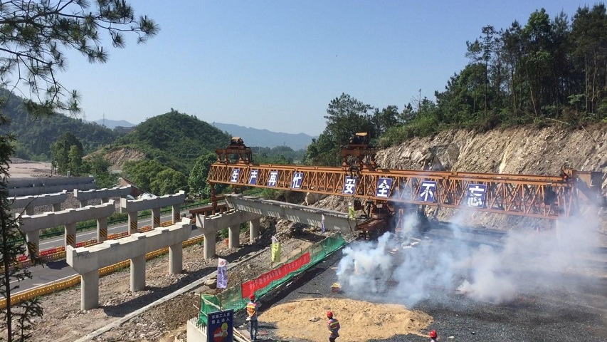 G206東堯段02標(biāo)梅公大橋首片箱梁成功架設(shè)