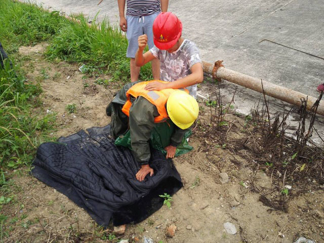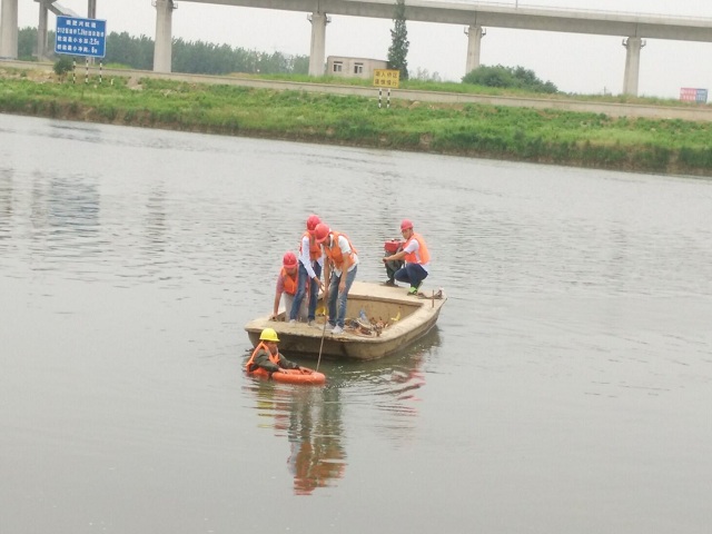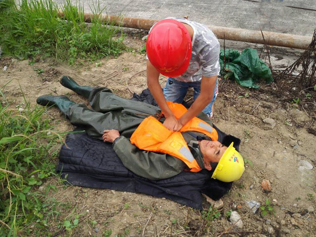 演練假設在合肥港上游2#靠船墩施工作業(yè)平臺處臨水面作業(yè),一名工人不慎失足跌落水中,工人身體狀況良好,落水時穿戴有救生衣。由于不會水性,在水中拼命掙扎嗆了好幾口水,體力不支,身體慢慢開始下沉,現(xiàn)場救援人員迅速營救落水者上岸,發(fā)現(xiàn)其已經(jīng)處于休克昏迷狀態(tài),應急救援人員對落水者進行人工呼吸和心肺復蘇后緊急送往醫(yī)院。