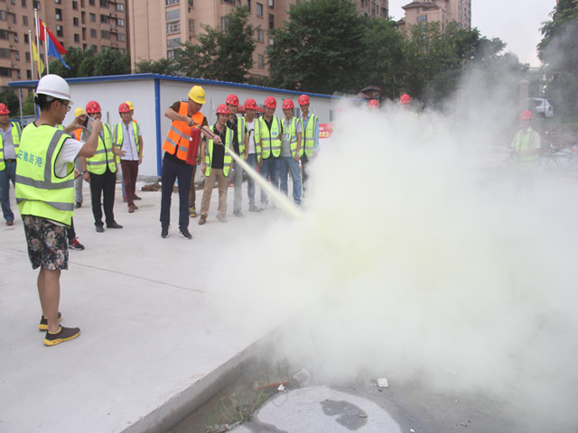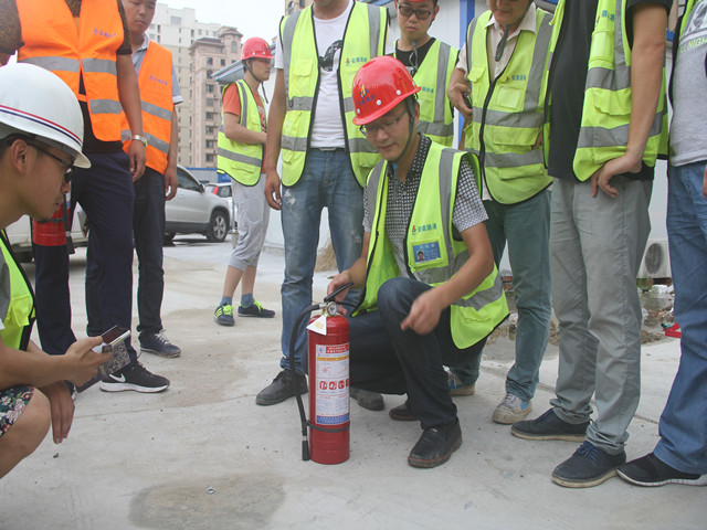 演練分為兩部分進行,第一部分是在銅陵北路高架項目部生活區(qū)進行疏散、逃生、救援演練,演練從14:00開始,至15:30結(jié)束。整個演練從預(yù)警、逃生、救援、滅火展開,善后工作到講評,層次分明有序。救護組技能動作規(guī)范迅速;滅火指揮程序清楚;各環(huán)節(jié)的請示報告、下達命令、語言表達簡短準(zhǔn)確。第二部分是在物流大道臨建場地進行滅火器使用方法與實際操作講解,要求所有人員正確掌握滅火器的使用方法,做到臨危不亂,快速的處理險情。