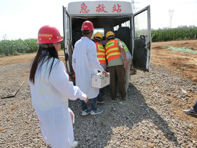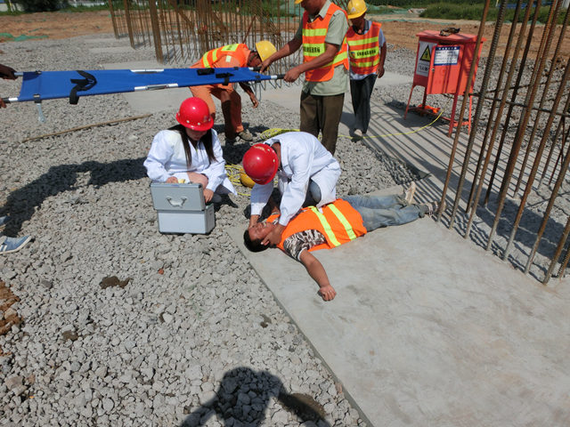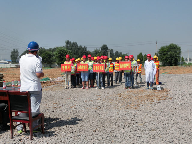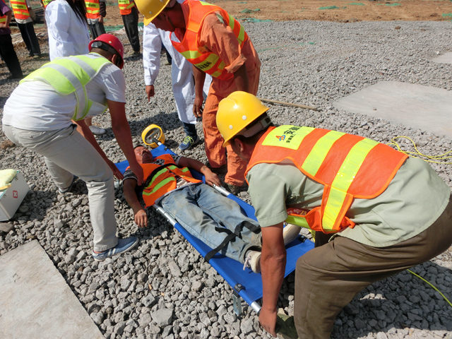 上午10點(diǎn)整,演練正式啟動。專職安全員王云飛宣讀了救援演練方案和人員分工。此次演練模擬了人員觸電、高處墜落、高溫中暑的情景,事故發(fā)生后,現(xiàn)場人員立即向項(xiàng)目部應(yīng)急領(lǐng)導(dǎo)小組報告并撥打120要求救援。項(xiàng)目部應(yīng)急領(lǐng)導(dǎo)小組接到事故報告后,立即啟動應(yīng)急救援預(yù)案并組織救援人員對受傷人員進(jìn)行初步急救,待120救援人員趕到后,立即用擔(dān)架將受傷人員轉(zhuǎn)移到救護(hù)車上進(jìn)行進(jìn)一步治療,應(yīng)急演練到此順利完成。