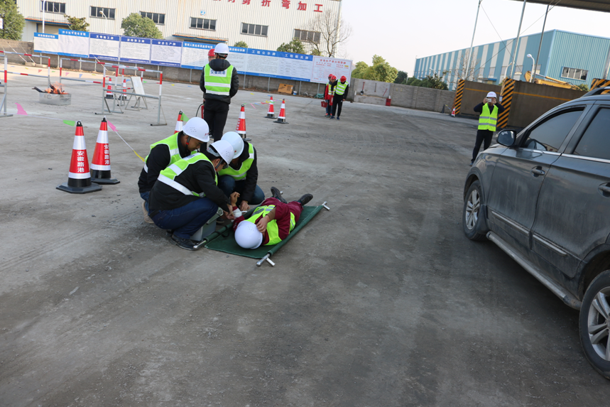 本次演練分為兩個(gè)步驟進(jìn)行。首先在項(xiàng)目部會(huì)議室召開預(yù)案演練布置會(huì),講解本次演練的主要內(nèi)容、應(yīng)急程序、注意事項(xiàng)、人員分工及救援器材的使用方法。隨后進(jìn)行現(xiàn)場(chǎng)實(shí)際演練,模擬后場(chǎng)著火并且有三人被困,其中一人受傷嚴(yán)重,總指揮得到消息后立刻啟動(dòng)應(yīng)急預(yù)案,疏散警戒組首先對(duì)火災(zāi)現(xiàn)場(chǎng)進(jìn)行警戒,確保周圍人員安全,然后派搶險(xiǎn)組進(jìn)入現(xiàn)場(chǎng)查看火情并通知救護(hù)組前來救治傷員,傷員救出后搶險(xiǎn)組進(jìn)行搶險(xiǎn)與滅火。