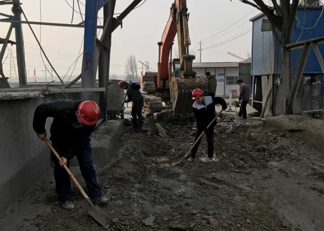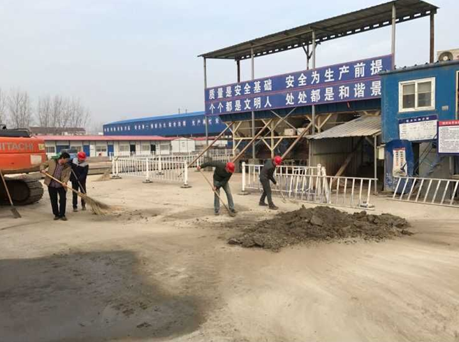 在后場的場站大門、分區(qū)隔離帶、拌合站等處,突擊隊(duì)員們有的掃、有的鏟、有的運(yùn)、有的推,個(gè)個(gè)干勁使足,有條不紊地對各處的塵土、淤泥、結(jié)塊混凝土進(jìn)行清理。