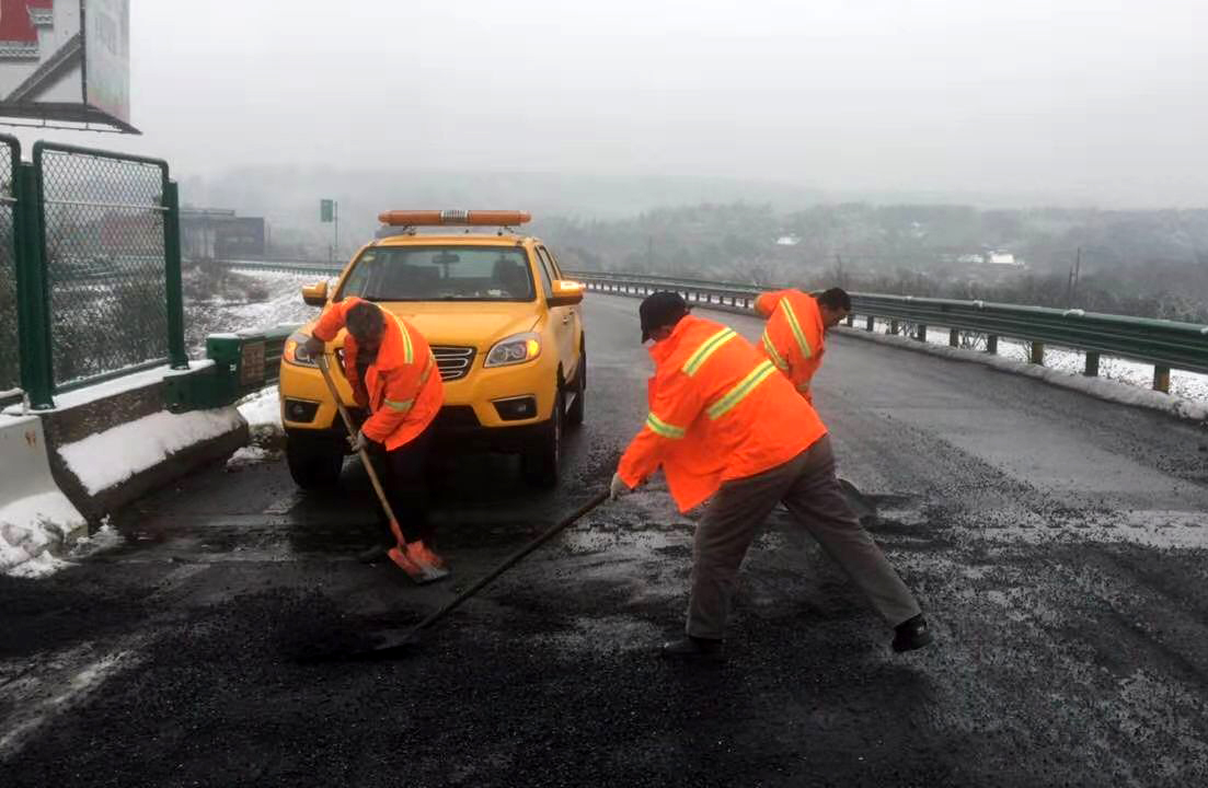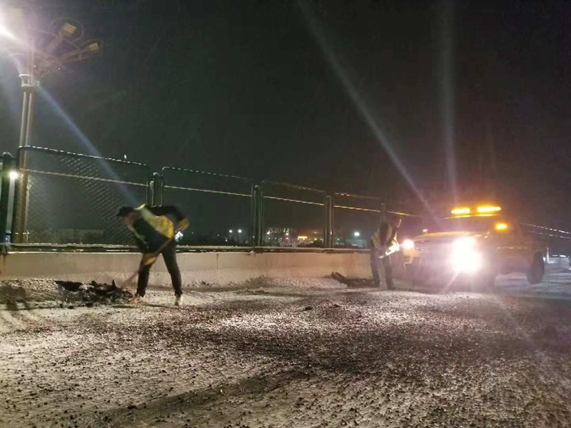 項(xiàng)目部爭分奪秒,調(diào)度組織各類除雪設(shè)備全天候?qū)Φ缆愤M(jìn)行除雪作業(yè)。針對易結(jié)冰橋梁路段、易積雪沿線重點(diǎn)路段等機(jī)械作業(yè)效果不理想的路段,全體人員連夜出擊,撒布融雪劑、瓜子片等,并積極配合高速公司融雪劑撒布車加料、整理和裝卸。