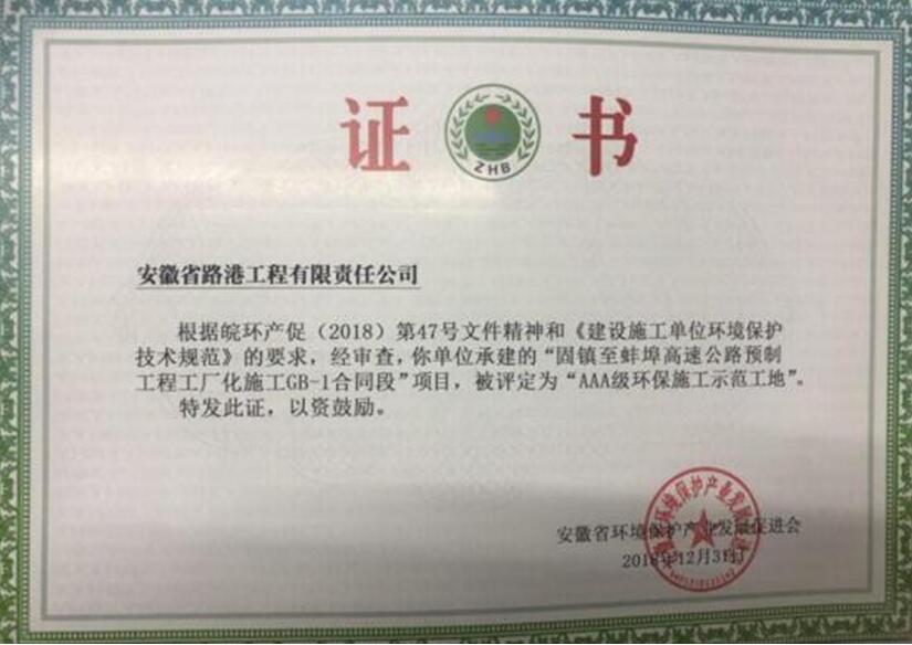 近日,安徽路港固蚌高速GB-1合同段項(xiàng)目部被安徽省環(huán)境保護(hù)產(chǎn)業(yè)發(fā)展促進(jìn)會(huì)評(píng)定為“AAA級(jí)環(huán)保施工示范工地”。