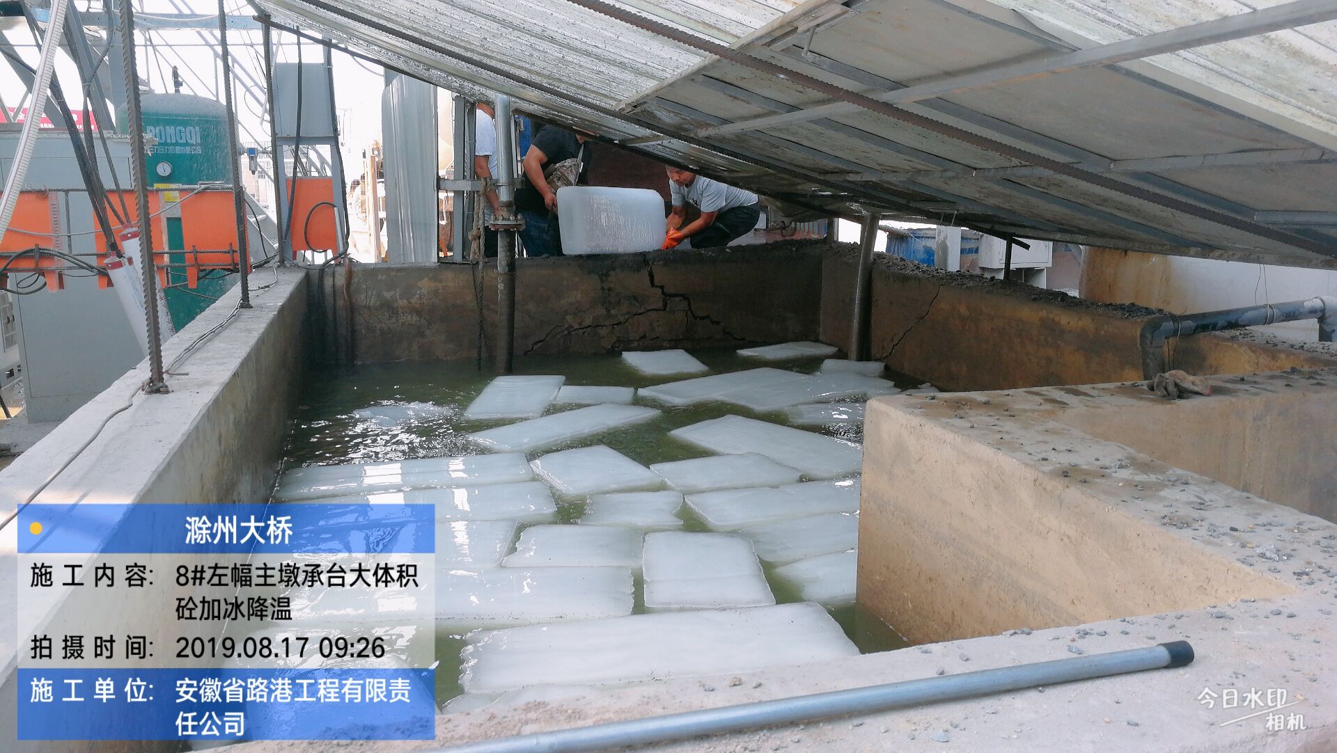 為順利完成混凝土澆筑作業(yè),項目部提前謀化,認真做好施工部署及交底工作。因天氣炎熱,對大體積混凝土的施工技術(shù)要求較高,在施工中要防止混凝土因水泥水化熱引起的溫度差產(chǎn)生溫度應力裂縫。為此,項目部采用拌合水加冰降溫及內(nèi)設冷卻管循環(huán)水施工方法進行溫控,在承臺中布設10個測溫點,保證成品施工質(zhì)量。施工完成后,項目部認真收集工藝參數(shù),做好首件工程施工總結(jié),為后續(xù)施工打下堅實基礎。