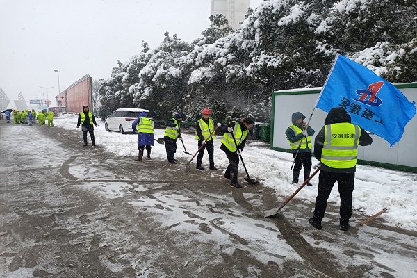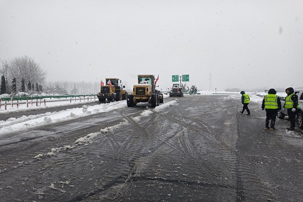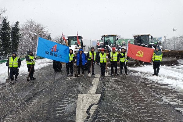 項目部積極組織保通協(xié)管人員,全線巡邏處理標段內高速路段交通事故,發(fā)生事故路段及時維護、設置警戒標志,配置拖車對事故車輛及時拖離。同時調集2臺平地機、4臺裝載機,號召項目全體黨員干部組成黨員先鋒隊,帶領項目職工近30人,積極投身抗冰除雪一線。經(jīng)過近5個多小時的共同努力,桐城收費站站前廣場、收費站匝道區(qū)域的積雪得到了有效清理,標段內高速道路安全暢通,得到業(yè)主及一路多方一致好評,展現(xiàn)了安徽路港的責任與擔當。
