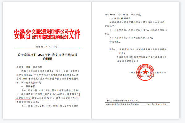 近日,合周高速壽潁段路基03標項目部在安徽交控集團合周高速壽潁段項目辦舉辦的2021年四季度考核中榮獲第二名,使項目部全體員工備受鼓舞。在新的一年里,全體員工將全力以赴,保質保量完成各項節(jié)點任務,致力于打造“踐行安徽精度,打造六好壽潁”品牌項目。