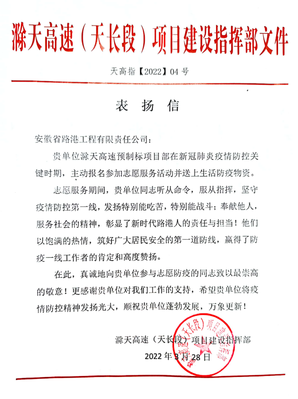 3月28日,滁天高速(天長(zhǎng)段)項(xiàng)目建設(shè)指揮部發(fā)來表?yè)P(yáng)信,對(duì)滁天預(yù)制標(biāo)項(xiàng)目志愿者積極參與疫情防控,提供防疫物資表示感謝。項(xiàng)目志愿者們發(fā)揚(yáng)“特別能吃苦,特別能戰(zhàn)斗”的企業(yè)作風(fēng),彰顯了新時(shí)代青年人的責(zé)任與擔(dān)當(dāng)。