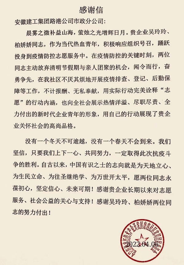 清明節(jié)期間,分公司員工吳玲玲與柏嬌嬌赴新站區(qū)磨店社區(qū)參與志愿服務(wù)活動(dòng),全力配合社區(qū)完成疫情排查、人員信息登記、后勤保障等工作,為此新站區(qū)磨店社區(qū)特發(fā)來感謝信。